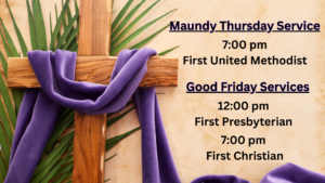 Good Friday services will be held at 12:00 pm at the First Presbyterian Church and 7:00 pm at the First Christian Church.